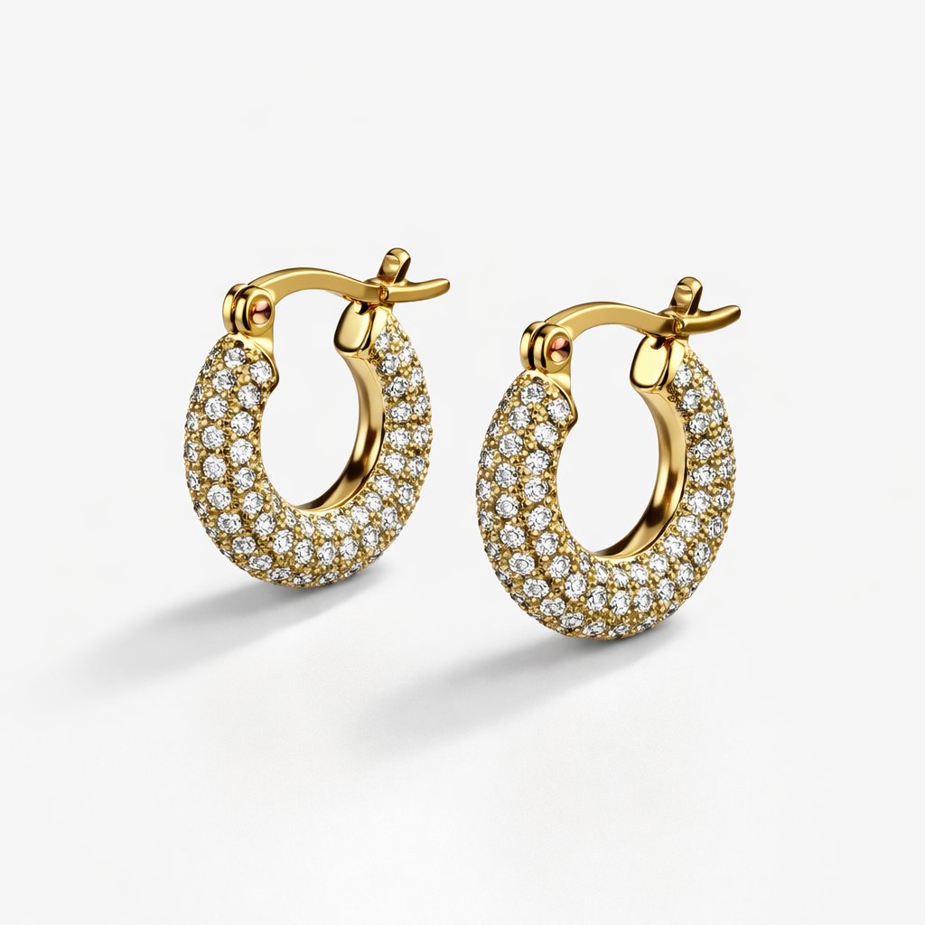 Raffinati e luminosi, questi orecchini a cerchio in acciaio inossidabile color oro sono impreziositi da un elegante pavé di zirconi che dona una brillantezza straordinaria. Il design bombato e compatto li rende perfetti per aggiungere un tocco di lusso discreto a qualsiasi look, dal quotidiano alle occasioni più speciali. Realizzati in acciaio inossidabile di alta qualità, garantiscono resistenza, durata e una brillantezza che rimane nel tempo. La chiusura sicura assicura comfort e stabilità per un utilizzo quotidiano.