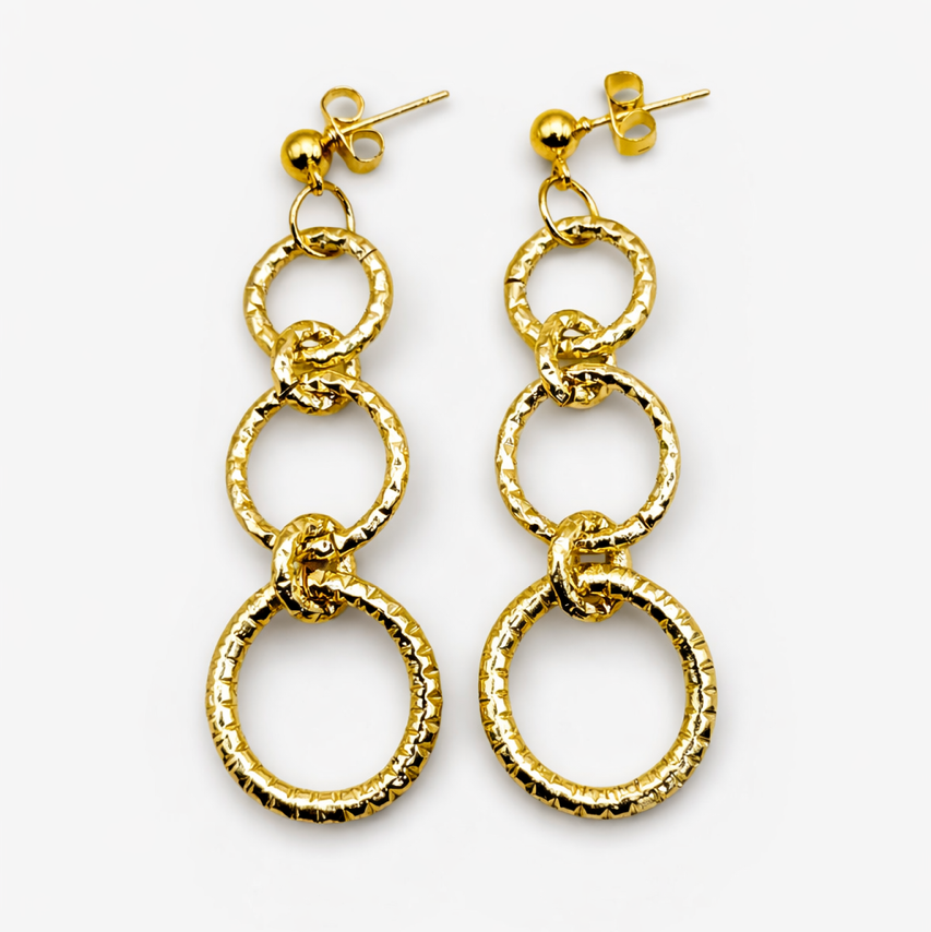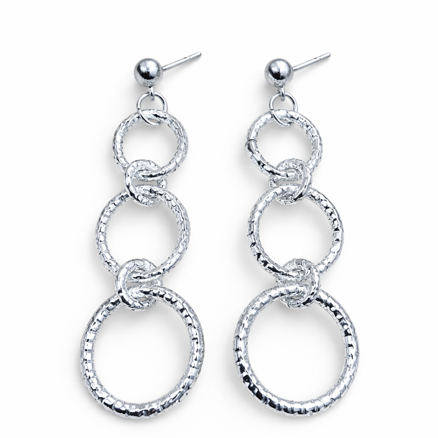 Orecchini pendenti realizzati con catena di rondelle in alluminio effetto satinato. Chiusura con monachella tonda in acciaio inossidabile con farfallina.
