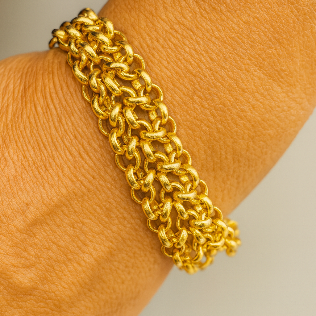 Polsiera realizzato con rondelle in alluminio di misura 6mm lavorate a trama gioiello. Chiusura con moschettone in acciaio inossidabile. Il bracciale ha una misura standard di 18cm e dispone di una prolunga finale.